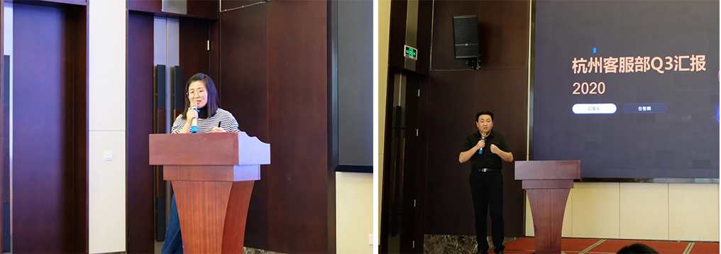 接下來,南京首屏副總經(jīng)理高娜、杭州客服部總監(jiān)任智鵬分別針對南京、杭州客服業(yè)務(wù)開展工作匯報,深度剖析Q3工作成果、分析總結(jié)存在的問題和難點,并對Q4的工作重心進(jìn)行詳細(xì)規(guī)劃。